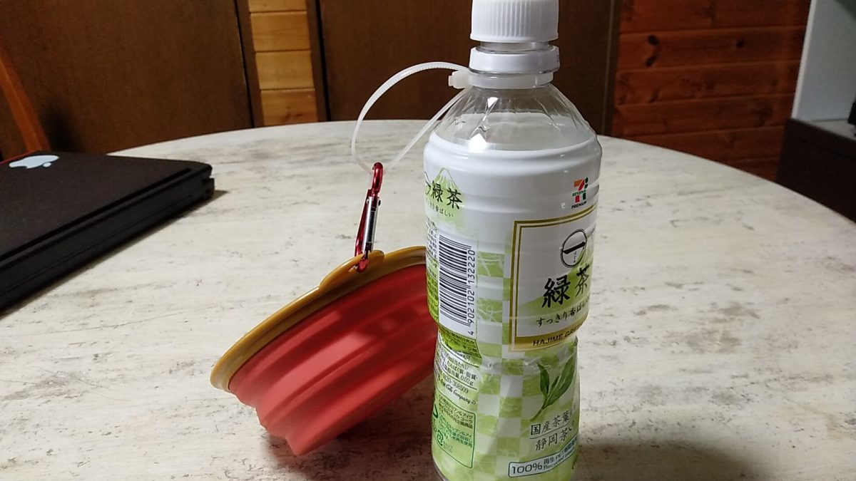 - 犬用の水容器:水分補給は重要です。水はどこでも買うことができますが、意外に入れ物を忘れがち。対策として、清潔なペットボトルに、結束バンドでフックを作り、携帯用容器をつけてあります。これを普段からお出かけ用グッズに入れています。