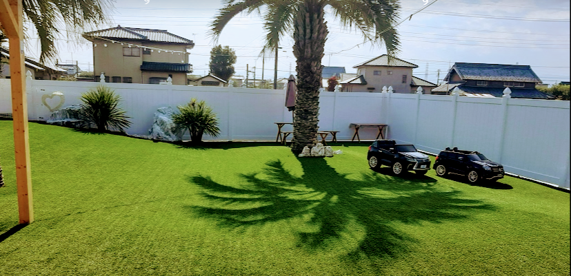 人工芝がきれいに敷き詰められ、それぞれに水場があります。水飲み容器と、じょうろ。じょうろはおしっこをしたところを流すために使います。↓