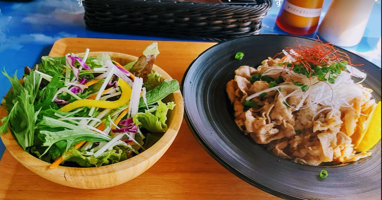 天気がいいのでテラス席で食べました。夫が注文したランチ、確か「とんとん丼~」みたいな名前。ドリンク付き1380円。味はとても美味しかったとのこと。↓