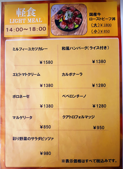 ランチ11:00~14:00、ディナー18:00~21:30(ラストオーダー)。デザートメニューはいつでも頼めます。ランチとディナーの間にライトミールメニューがあります。中途半端な時間帯に食べたいときうれしい。↓