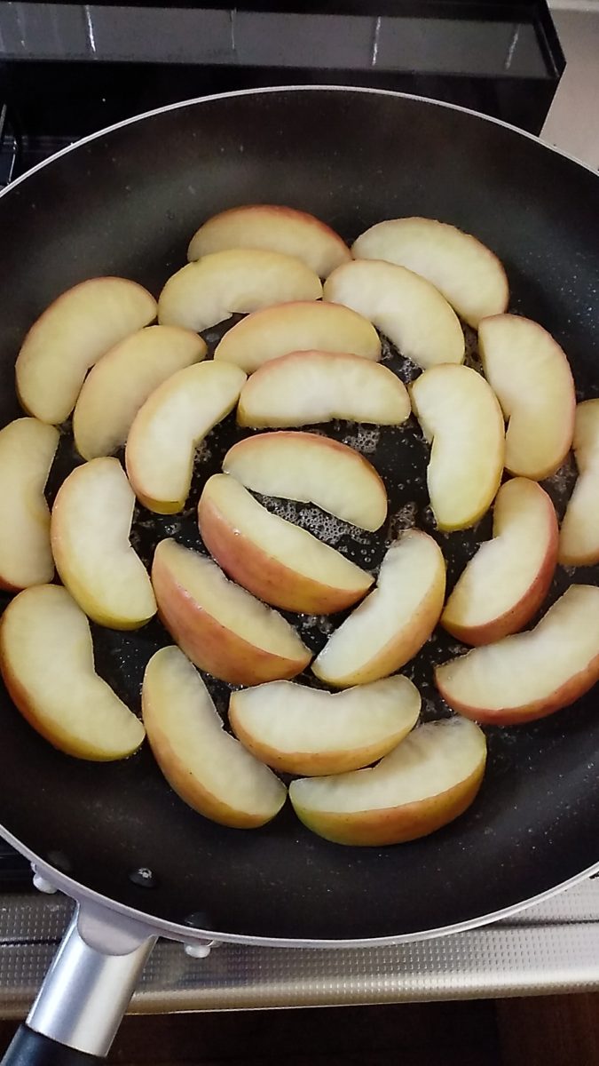 簡単な調理方法があります。フライパン1つで作れます。しかも、できた時りんごの表面にうっすらと付いている美味しそうな焦げ目は、電子レンジではできない技です。