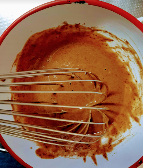 • たまご、ぬるま湯を加え、泡だて器で混ぜる。