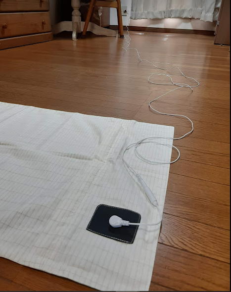 下の写真は、黒いコードから赤いコードに電気が流れている様子です。枕カバーの銀糸の部分に黒コードの針を置くと、このように電気が流れます。ここに私が寝れば、寝ながら放電できるということです。