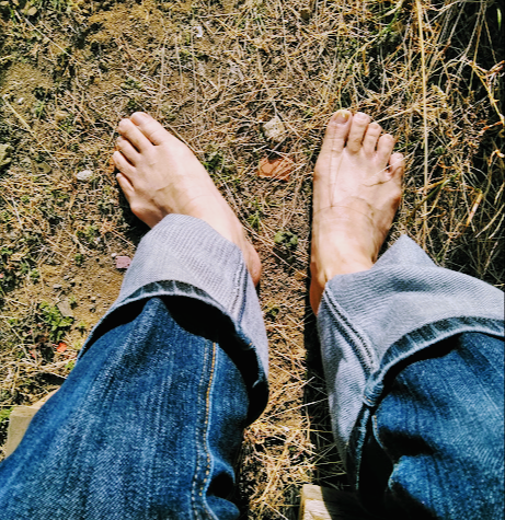 裸足で地面に立つ